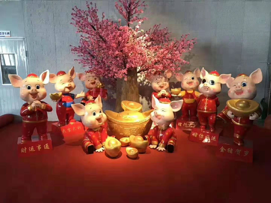 新年美陈讲究喜庆吉祥,猪年就多体现猪的元素,吉祥猪能给人以带来吉祥,财运,健康的象征!大红色是新年美陈的主打色彩,中国人讲究红红火火!